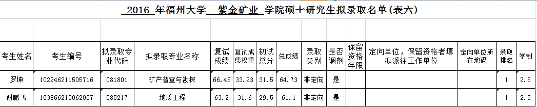 紫金矿业学院2016年硕士研究生第二轮拟录取名单公示