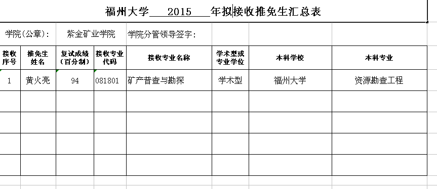 紫金矿业学院2015年拟接收推免生名单(第二轮)