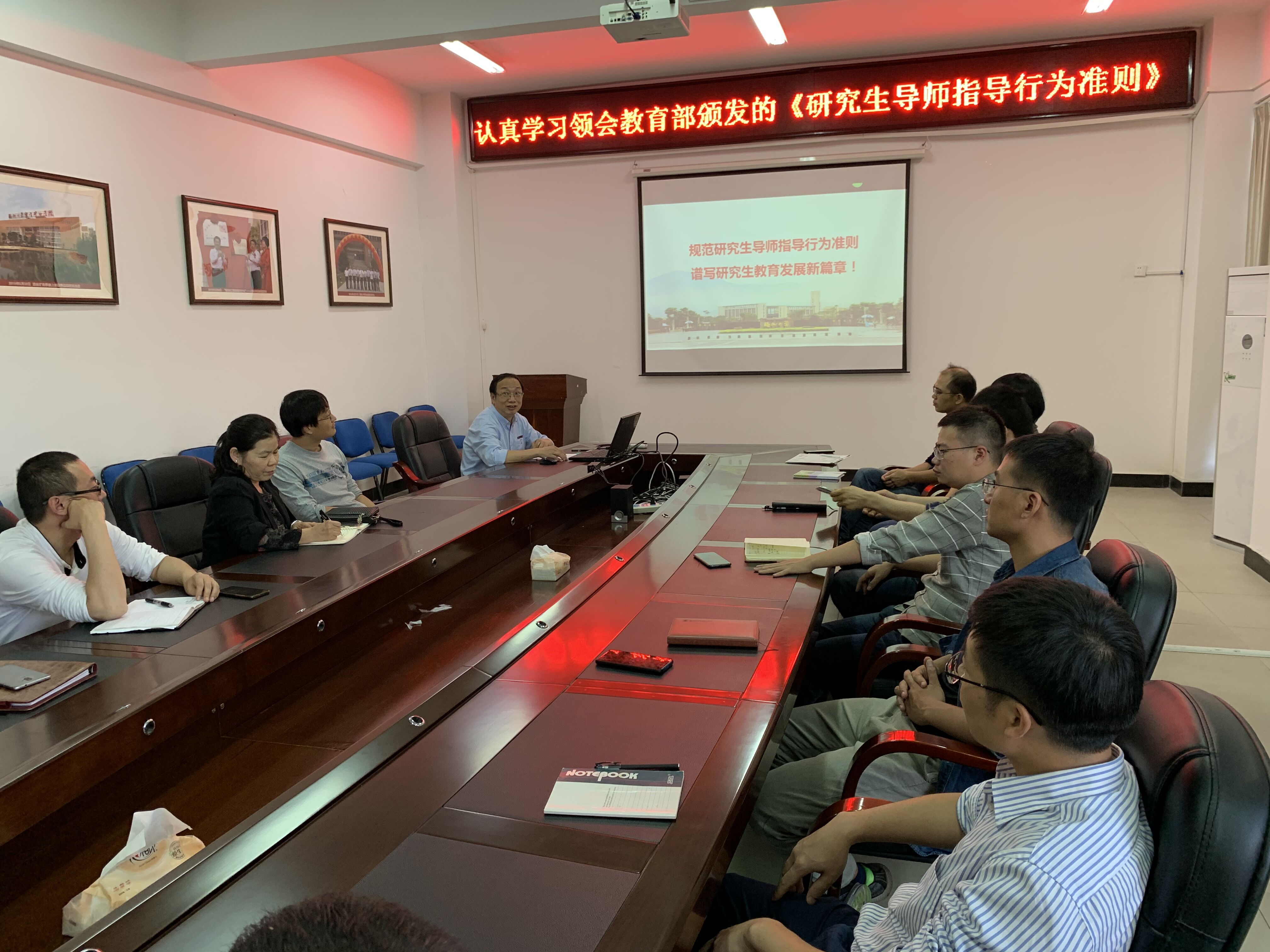 为进一步加强研究生导师队伍建设,规范导师指导行为,努力造就有理想信念、有道德情操、有扎实学识、有仁爱之心的新时代优秀导师,果冻传媒 于2020年11月18日下午在紫金楼219会议室,组织全体研究生导师召开了“规范研究生导师指导行为准则,谱写研究生教育发展新篇章”的专题学习会议。会议由黎敦朋副院长主持,到会人员为在榕导师20余人。