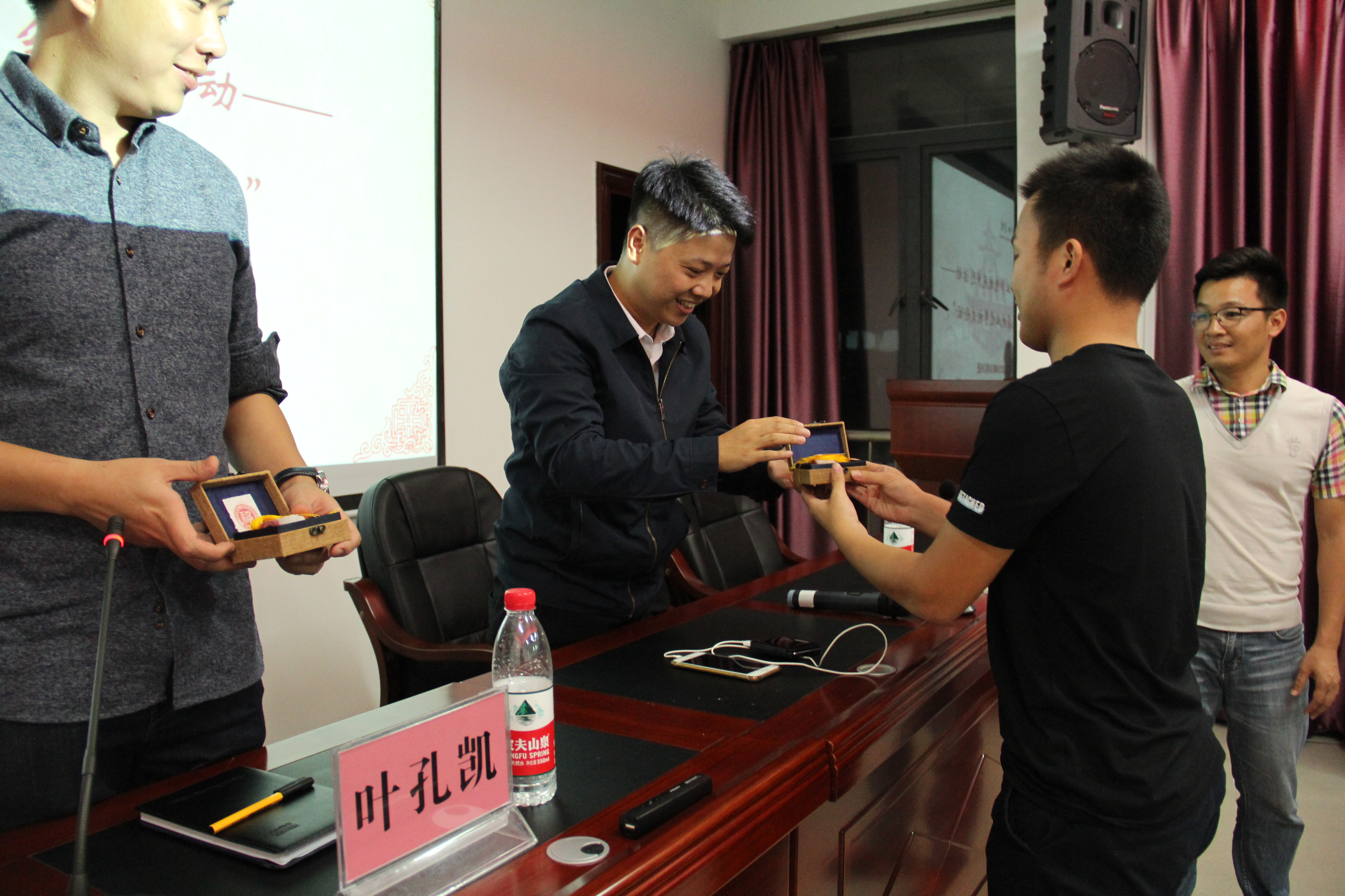 此外,院团委副书记江建辉同学为两位校友献上果冻传媒 纂刻协会精心准备的六十周年校庆纪念品,表达了同学们的感谢之情。