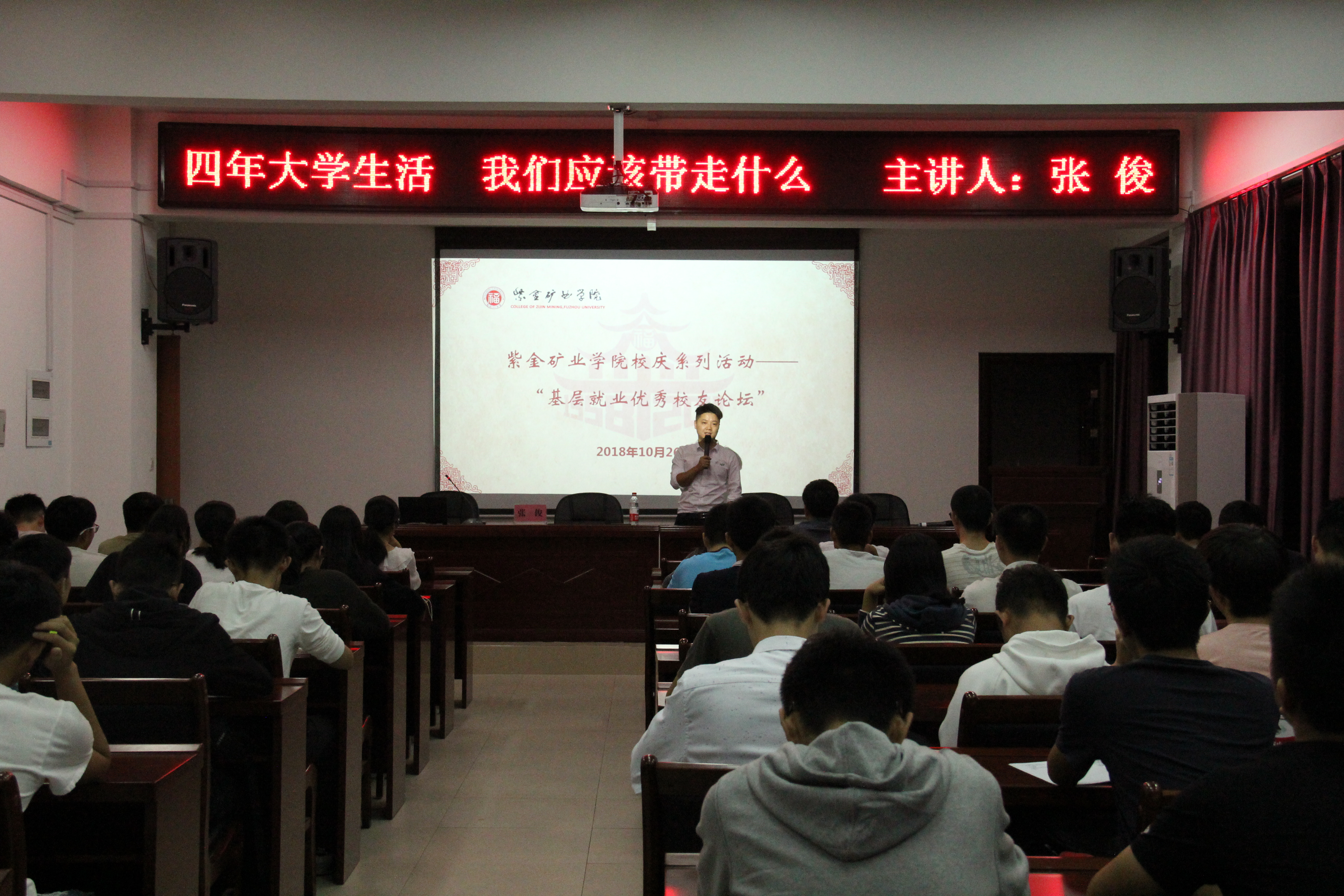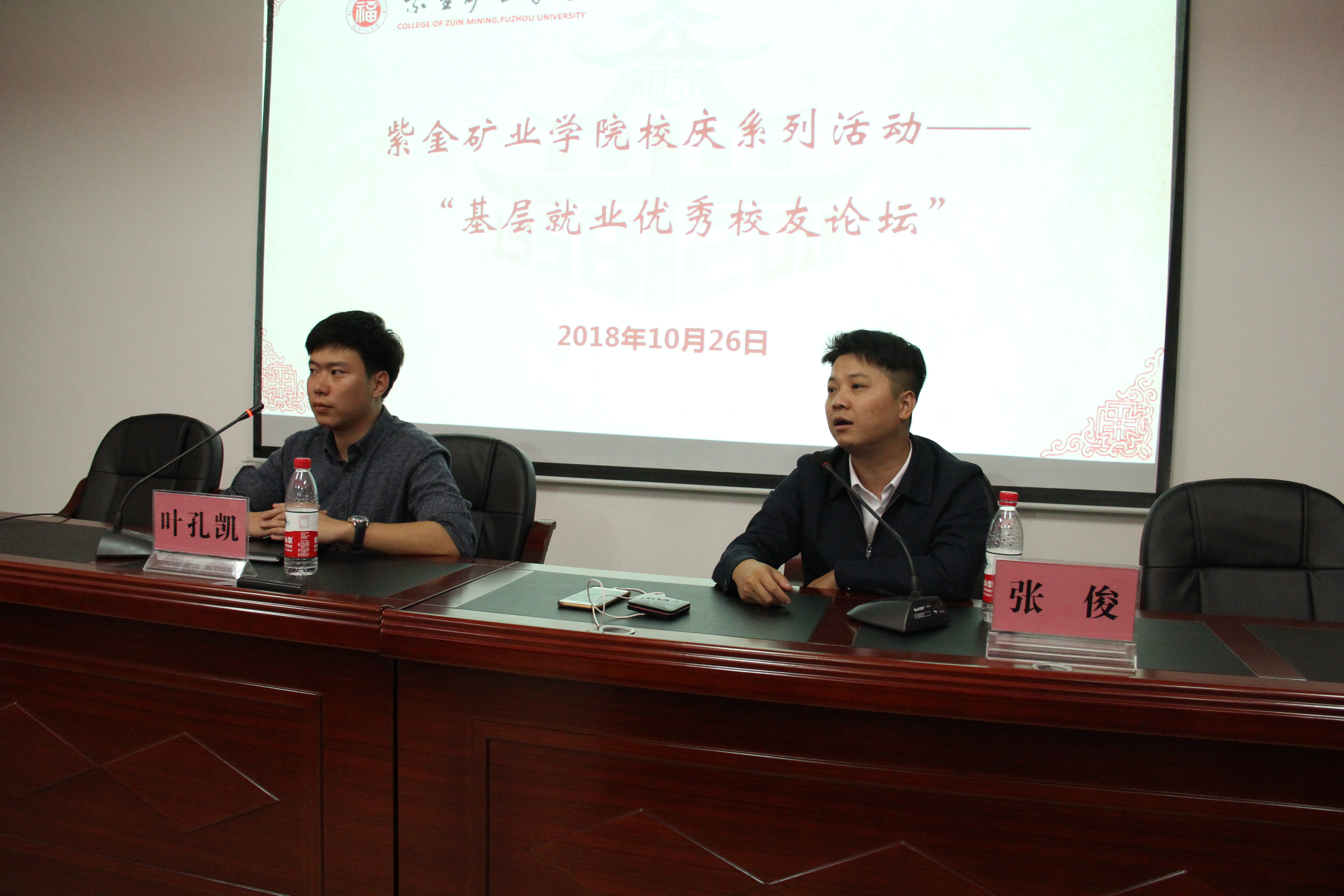恰逢我校建校60周年,为加强校友和在校学生的交流与联系,10月26日晚7点,果冻传媒 在学院304开展“基层就业优秀校友论坛”。果冻传媒 2011届毕业生代表建宁县均口镇党委副书记张俊、中国建筑材料工业地质勘查中心福建总队地勘院副院长叶孔凯来到学院与学弟学妹们亲切交流,出席活动的领导老师有院党委副书记郑寿、院团委书记李金土、学院综合办副主任钟祥华、辅导员翁惠玲老师。