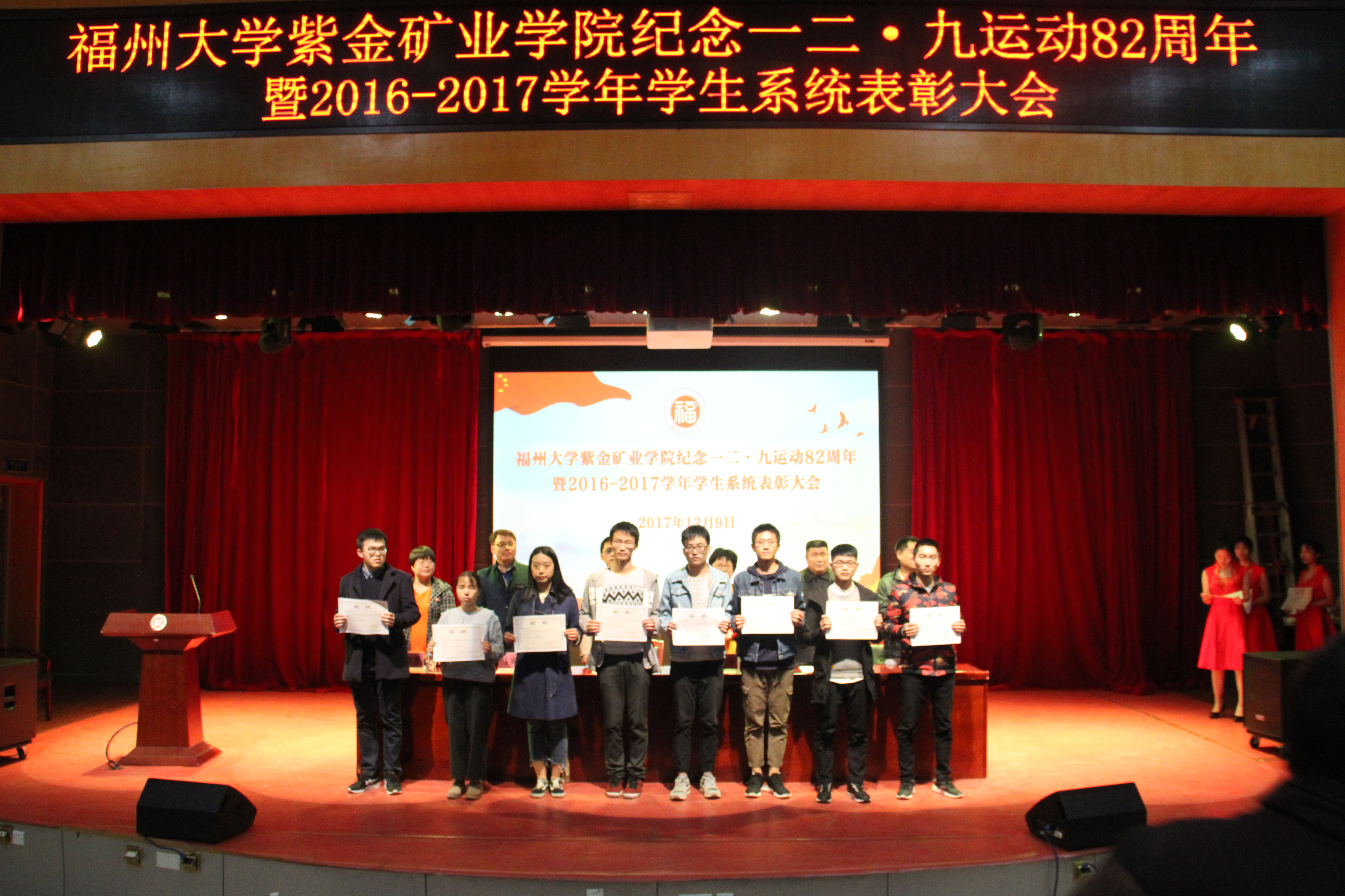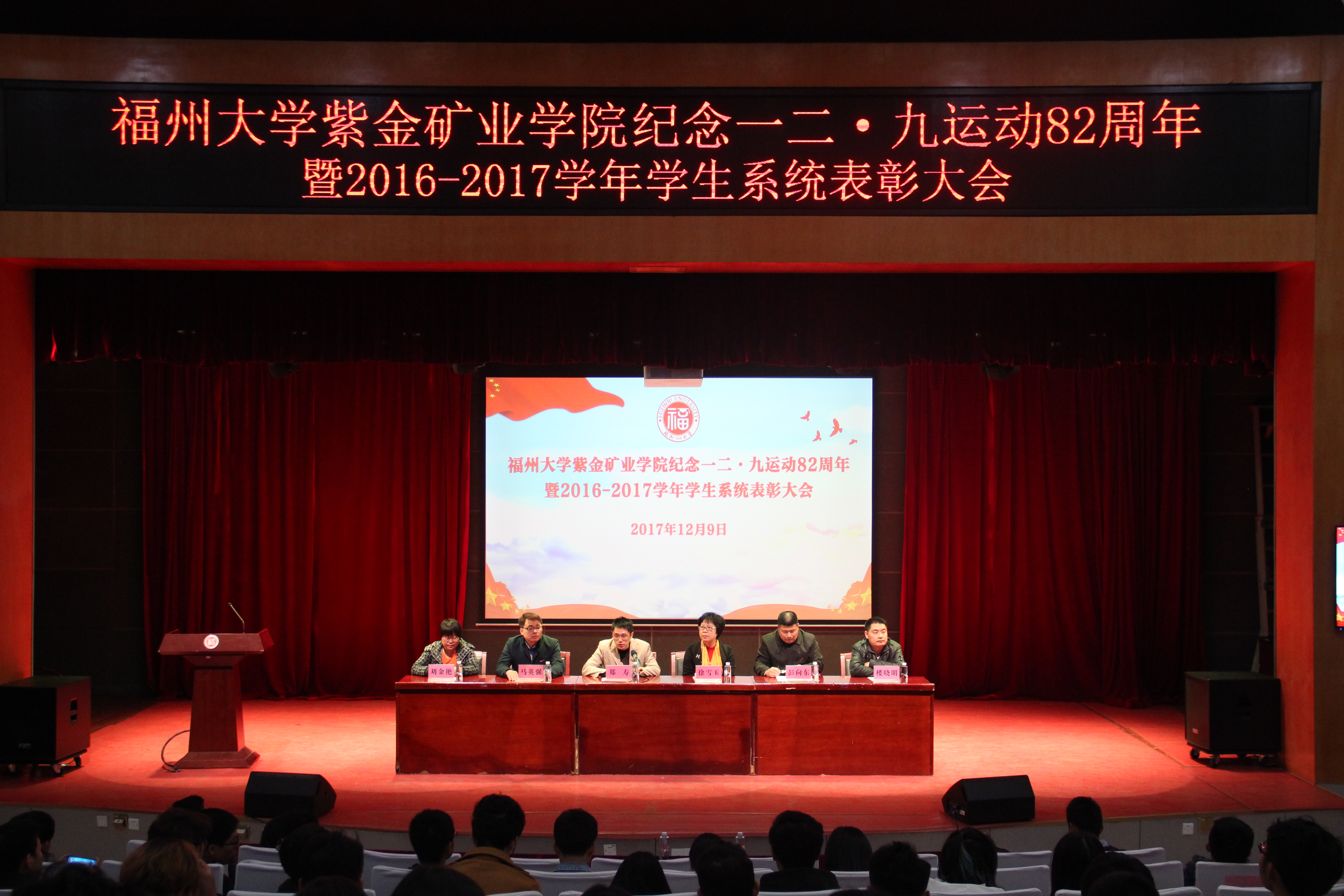 2017年12月9日晚,果冻传媒 召开举办纪念一二·九运动82周年暨2016-2017年度学生系统表彰大会,旨在铭记历史,表彰先进,传承作风。院党委书记徐雪玉、院党委副书记郑寿、副院长彭向东、学院党委委员马英强老师、采矿工程系主任楼晓明、矿物加工工程系副主任刘金艳及部分专业老师和各年级辅导员出席了本次大会。