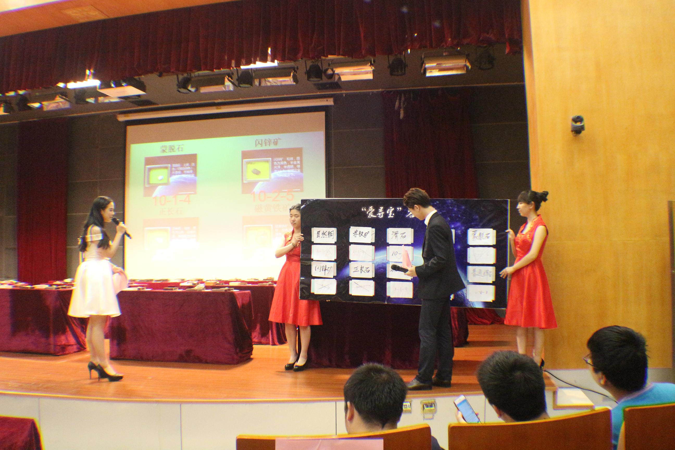 此次地学知识竞赛分初赛和决赛两个阶段。通过初赛的笔试,共选取了八队笔试队伍进入决赛。决赛分为“寻宝石,爱答题”两个环节,在“寻宝石”环节中,各支队伍需要在寻宝之前抽取装有相关信息的信封,并在两分钟之内阅览完毕。寻宝开始后,参赛队伍进入寻宝区“寻宝”,即寻找图片中对应的矿石,并在矿石所在区域做上标记。每支参赛队伍都争分夺秒而又有条不紊地进行着寻宝活动,现场气氛紧张激烈。当工作人员宣布寻宝结束时,寻宝队伍必须迅速撤出寻宝区。在本轮竞赛中,经管学院的午时风队,紫金矿业学院的小二郎队全部答对,分数并列第一。随后是“爱答题”环节。本环节分成三轮,首轮为必答题,各个队伍均需回答十道题,答对加5分,答错不扣分。首轮各个队伍势均力敌,分数相当。第二轮为抢答题,答对加10分,答错扣10分,题目难度相对必答题有了明显的提高,各队之间分数渐渐有了差距。第三轮为决胜局,皆为难度系数较高的题型,参赛队伍可选择是否继续进行,对于在一分钟之内回答出的队伍给予10、20、30、40四种等级的奖励,反之则扣除相应分数。