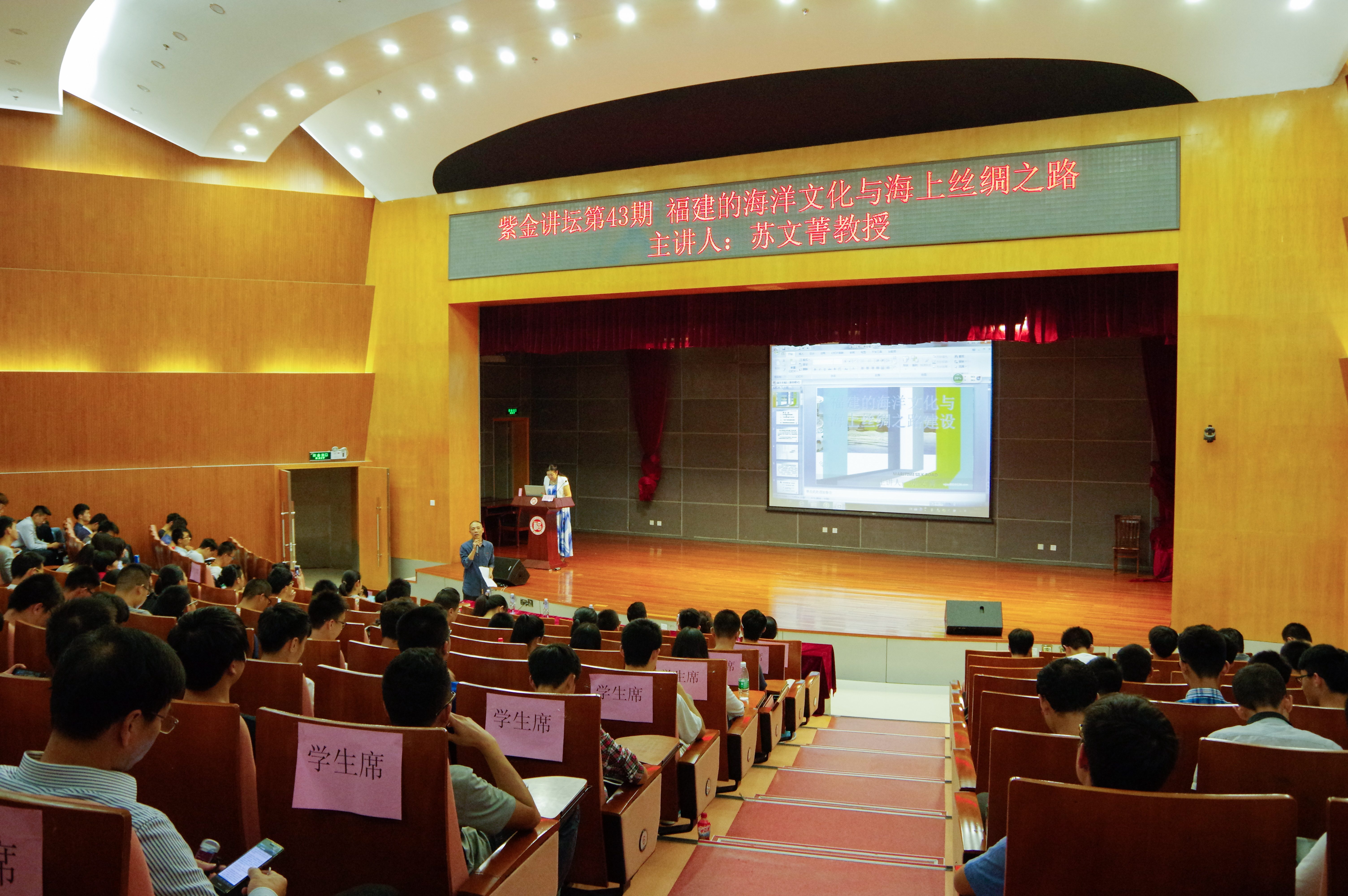 2015年10月15日下午,学院第43期紫金讲坛在图书馆明德厅隆重举行。本次讲坛邀请了果冻传媒 闽商文化研究院院长苏文菁教授主讲,题目为《福建的海洋文化与海上丝绸之路建设》。学院党委副书记余飞以及部分专业教师和学生共200多人参加。