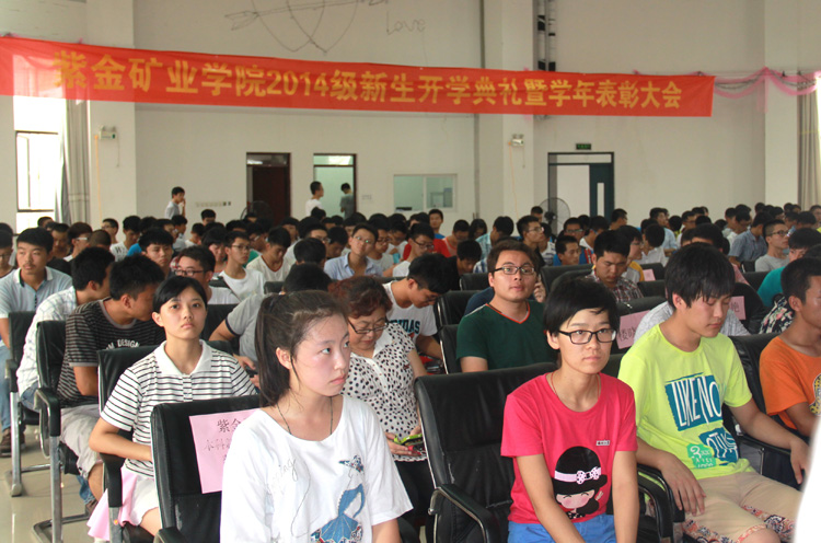 大会在庄严的《国歌》声中拉开序幕。彭向东副院长宣读了优秀新生奖助学金、学院年度先进集体和先进个人以及学院第二届“我心目中的好老师”等表彰决定。学院领导和紫金矿业集团代表为获奖教师和学生颁发奖状、奖金;其中,有三位来自紫金矿业集团的优秀企业工程型教师受到表彰。 2014级资源勘查工程专业林梦婧同学、学院首届“紫金之星”王聪聪同学和学院年度“育人先进个人”刘金艳分别代表新生、受表彰个人以及教师先后上台发言。最后,院党委黄培明书记在会上致辞,他首先代表全院师生欢迎175位新同学的到来,并对获得学院年度先进集体和个人表彰的师生表示祝贺和感谢。同时,他指出,学院经过七年多的建设,各方面都取得了可喜的进展,这些进步与紫金矿业学子们追求卓越、不断进取的精神是分不开的。他对2014级新生提出几点希望:希望新生同学们敢于有梦,勇于担当,正确认识所学的专业,立足于学习好地矿专业,成为高素质、国际化一流矿业人才,努力争当“未来中国乃全球地矿精英及领袖”。他希望同学们合理规划,勤奋学习,积极实践,争取以优异的成绩圆满完成学业;同时,还要学会做人,树立起正确的世界观、人生观、价值观,不断完善自我,博采众长,积极拓展综合素质,以适应时代发展对人才的要求。最后,黄培明书记希望同学们尽快调整好心态,适应新环境、融入新环境、热爱新环境,学会判断,健康成长。黄培明书记希望全院师生以学校建设高水平“211”大学为契机,着力加强师资队伍建设,学科平台建设,进一步深化校企合作,深入推进“紫金模式”的教育教学改革,全力提升办学水平,努力朝着建设高水平创业型矿业学院目标迈进。 开学典礼结束后,彭向东副院长为新生做了一场精彩报告。(黄少钦) )