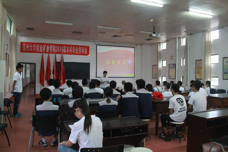 首先,李金土老师介绍了紫金矿业学院2014年大学生暑期社会实践总体安排部署,他强调,此次实践活动,是为积极响应党的十八届三中全会精神,积极践行大学生的实践意识,培养艰苦奋斗的精神。曾雪菲同学代表本次暑期社会实践的全体队员进行发言,一方面感谢学院对此次社会实践活动的大力支持,另一方面,也代表实践队全体同学向学院保证,此次实践活动必将按照学院部署,全力以赴,在实践中锻炼自我。随后,余飞副书记做了发言,他充分肯定了学院近年来大学生暑期社会实践活动取得的显著成效,并对即将出征的老师和同学们提出了四点希望和要求:一是加强教育,确保安全。要加强社会实践安全培训和教育工作,有效落实安全责任制。尤其强调学生人身安全注意事项,增强学生安全意识,对社会实践要制定安全预案;第二,艰苦朴素,锻炼意志。要求各实践队在实践过程中秉承节约意识,牢记实践主题,克服困难,不铺张浪费;第三,积极建立长效机制,在实践过程中,与地方做好沟通交流,争取建立长期实践点;第四,巩固机制,探索创新。要把暑期社会实践活动现有的机制更好的巩固,同时积极结合新情况,不断探索创新,将暑期社会实践工作做得更加扎实、更加富有成效。最后,各位老师共同为实践队伍授旗,并合影留念。 据悉,紫金矿业学院今年的暑期社会实践以“为祖国勤学修德•以实践明辨笃实”为主题,由学院团委组织各年段以项目申报的形式,从全院同学中,选拔优秀学生组成4支暑期社会实践队,其中包括一支省重点团队、一支校重点团队及若干支院重点团队。各个实践队将奔赴福建省各地,依托果冻传媒 上杭教学基地,深入农村、深入基层、深入实际,广泛开红色教育、社会调研、环境保护、爱心支教、校友访谈等实践活动。
