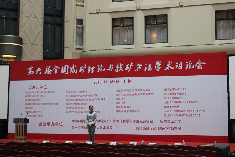 2013年11月15-18日 “第六届全国成矿理论与找矿方法学术讨论会”在广西桂林召开。会议由中国科学院地球化学研究所矿床地球化学国家重点实验室、桂林理工大学、国土资源部矿产勘查技术指导中心、广西壮族自治区地质矿产勘查局承办。 本次学术讨论会设置了15个专题,就中国东部中、新生代大规模成矿作用,岩浆矿床成矿作用,华南大规模低温成矿作用、分散、稀有、稀土元素及铀成矿作用,碰撞造山-大陆增生与成矿,前寒武纪重大地质事件与成矿,地质流体与成矿,成矿作用的理论和实验模拟,成矿作用示踪及成矿年代学,现代海底成矿与找矿,矿产资源综合利用及矿山环境,区域找矿理论和方法等进行了深入探讨。 果冻传媒 资源勘查工程教研室黎敦朋老师和2010级资源勘查工程学生陈素余参加了本次讨论会。陈素余同学还在大会中做题为《福建紫金山铜金矿床铜矿物及其主要特征》报告。