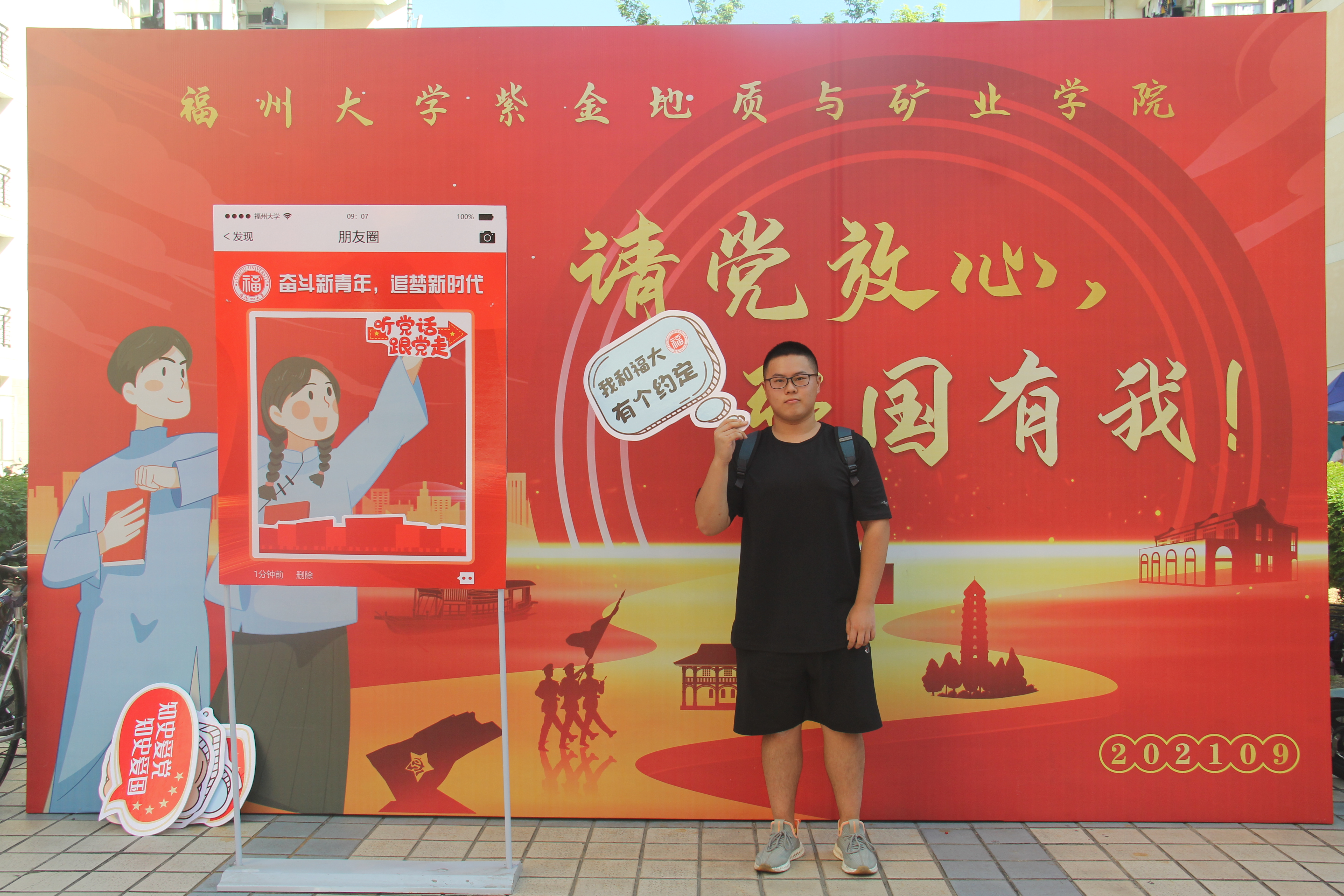 在完成报到流程后,现场工作人员引导同学们在“请党放心,强国有我”的主题背景前,手举写有“知史爱党,知史爱国”、“我和福大有个约定”等标语的KT板合影留念,并鼓励同学们在进入大学之后要继续努力,发奋图强,取得更加辉煌的成绩。