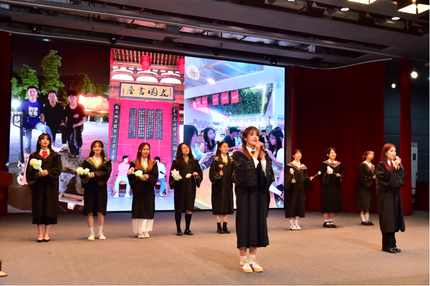在学位授予仪式前,毕业生代表们为大家带来了精彩的毕业主题曲目:《不说再见》、《我们的歌》、《直到世界尽头》和《凤凰花开的路口》,抒情动人的歌曲在耳旁响起,校园点滴剪辑成的视频映入眼帘,为毕业典礼增添了别样的风采。