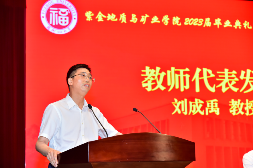 紧接着,刘成禹教授作为教师代表为毕业生送上祝福和期望,他通过自己的亲身经历故事,期望毕业生们保持谦虚,不断学习;多做事,不躺平;从小事做起,做一个靠谱的人;正确面对挫折,不做玻璃心;热爱母校,常回校看看。