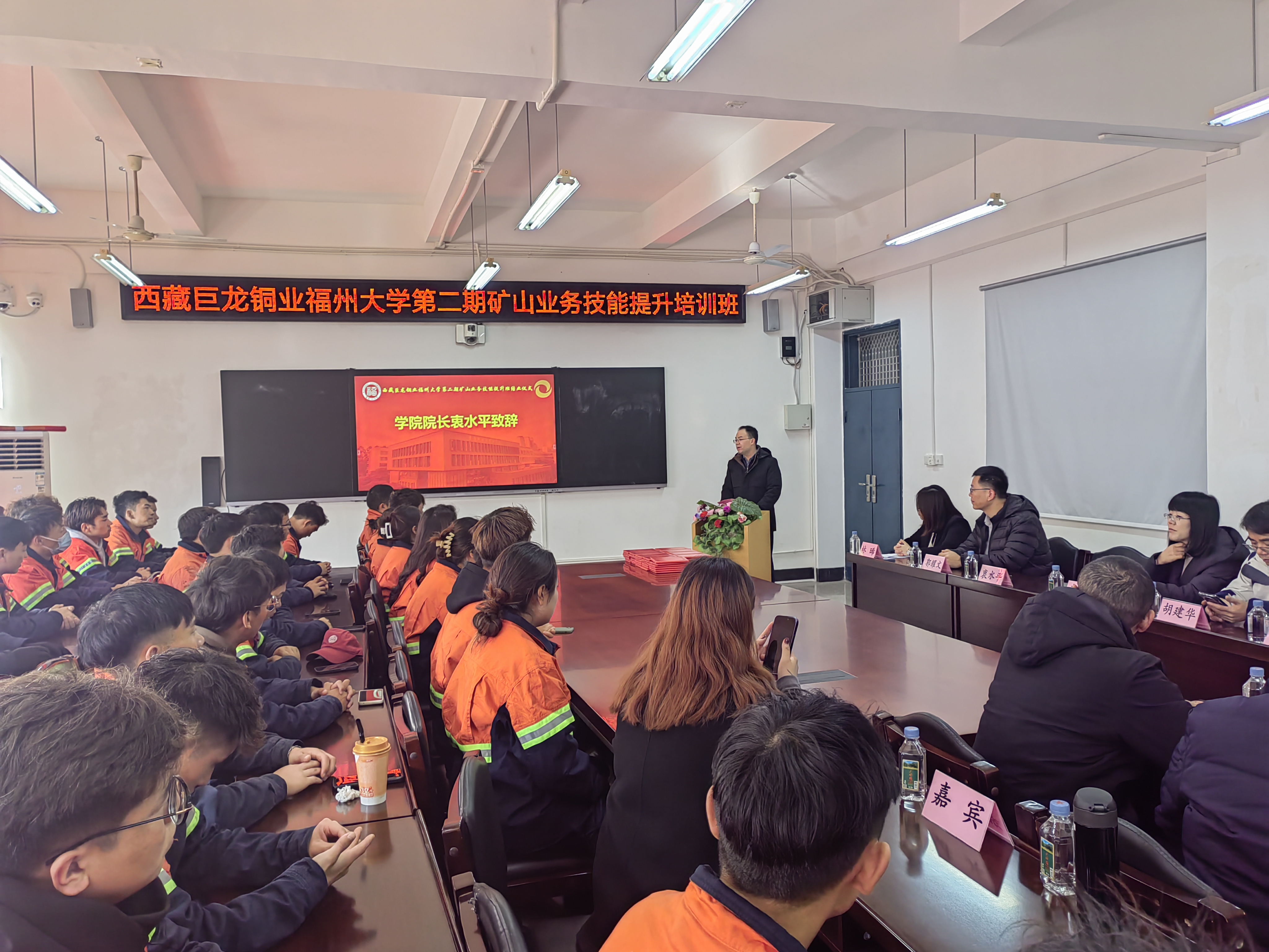 学院衷水平院长代表学院致辞。他首先代表全院师生员工,向努力奋斗顺利完成学业的学员们表示热烈的祝贺。并感谢紫金山金铜矿等相关单位以及授课的老师们;特别感谢业主单位西藏墨竹工卡县和西藏巨龙铜业的信任与支持;感谢总部人力资源部及兄弟单位的协调与配合。接着,院长结合自己在紫金矿业集团工作十五年来的认识和经历,给大家谈两点期望:一是要做新时代的奋斗者;二是要做科技创造紫金的践行者。“天高任鸟飞,海阔凭鱼跃”,奋斗的道路从来不是一马平川,泥泞难免,但心若阳光,则风雨兼程;未来是一场一往无前的旅行,没有成功的秘籍,也没有捷径,唯有坚定目标、执着奋斗,方能守的云开见明月。院长希望大家在前行的道路上,执一心、忠一道、成一事,不负寒窗、不负韶华,为青春添彩、为理想增色!