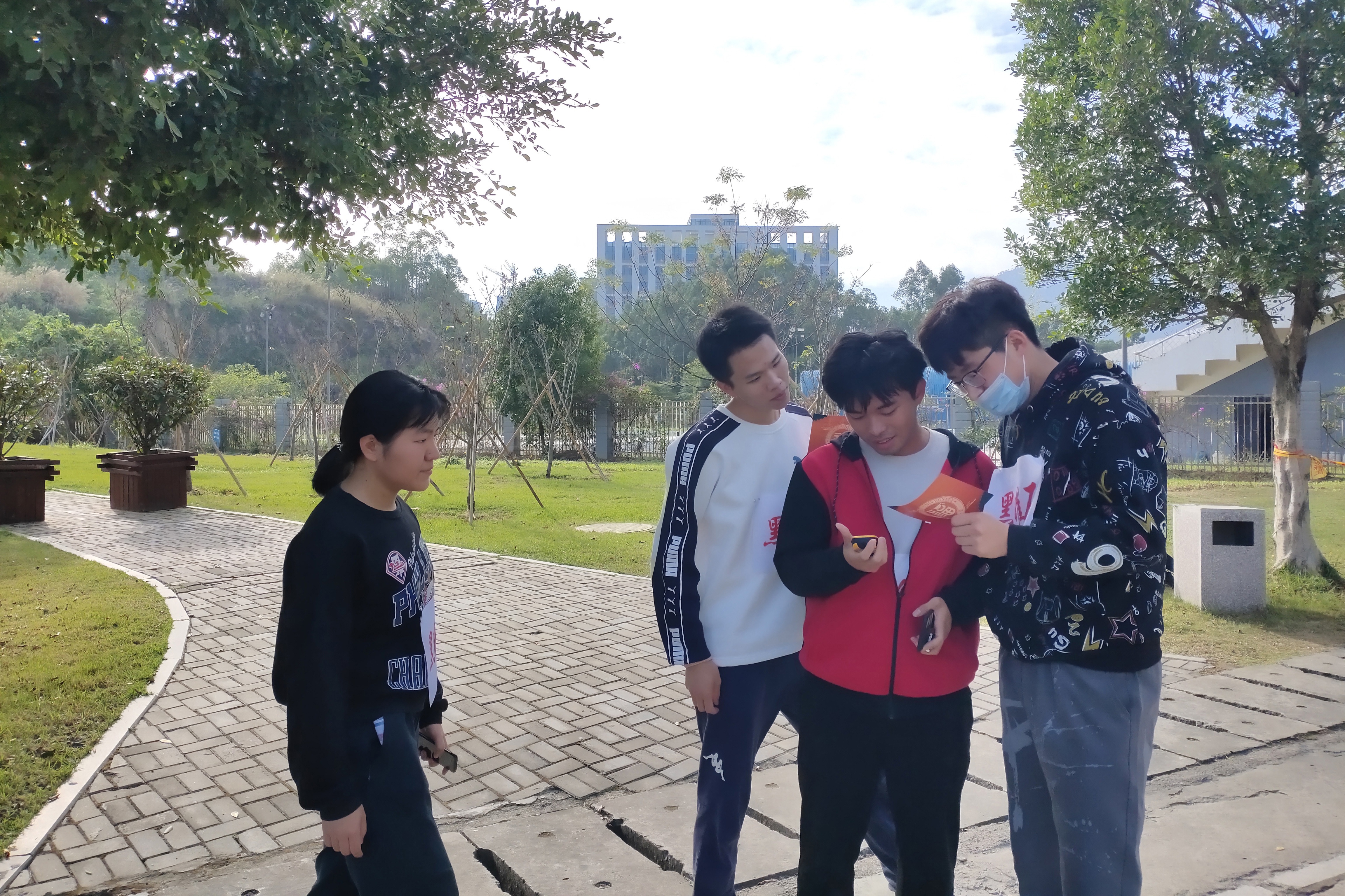 本次GPS定向越野大赛的主题是“坚定跟党走,奋进新时代”,出席活动的有院团委书记李金土老师,17、18级辅导员李延老师、18级兼职辅导员吴晓林老师、19级兼职辅导员官旭晖老师和20级兼职辅导员林梦婧老师。本次比赛范围涵盖了学校的每一个角落,15支参赛队伍需要通过回答关于疫情、地理、校情校历和生活常识等题目的方式,获取本支队伍的下一个坐标点信息,并根据主办方提供的校园地图、GPS定位仪等寻找相应的越野路线,按照游戏规则徒步完成整场比赛。