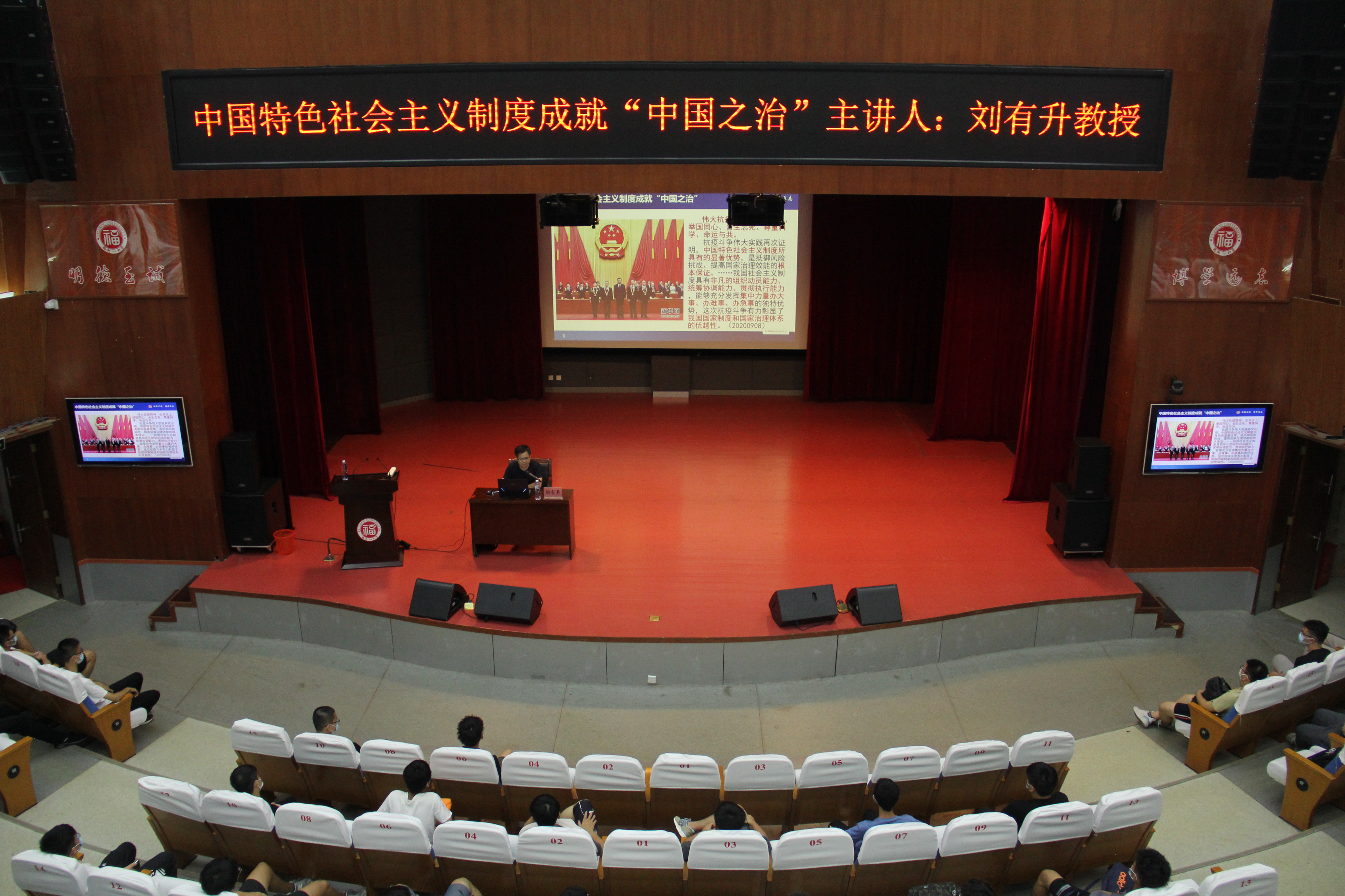 为普及思政教育,提高20级新生的思想政治水平,9月22日晚,果冻传媒 于图书馆博学厅召开主题为“中国特色社会主义制度成就的‘中国之治’”的思政教育讲座。本次讲座由马克思主义学院刘有升教授主讲,果冻传媒 辅导员李金土老师主持,2020级全体新生参加了本次会议。