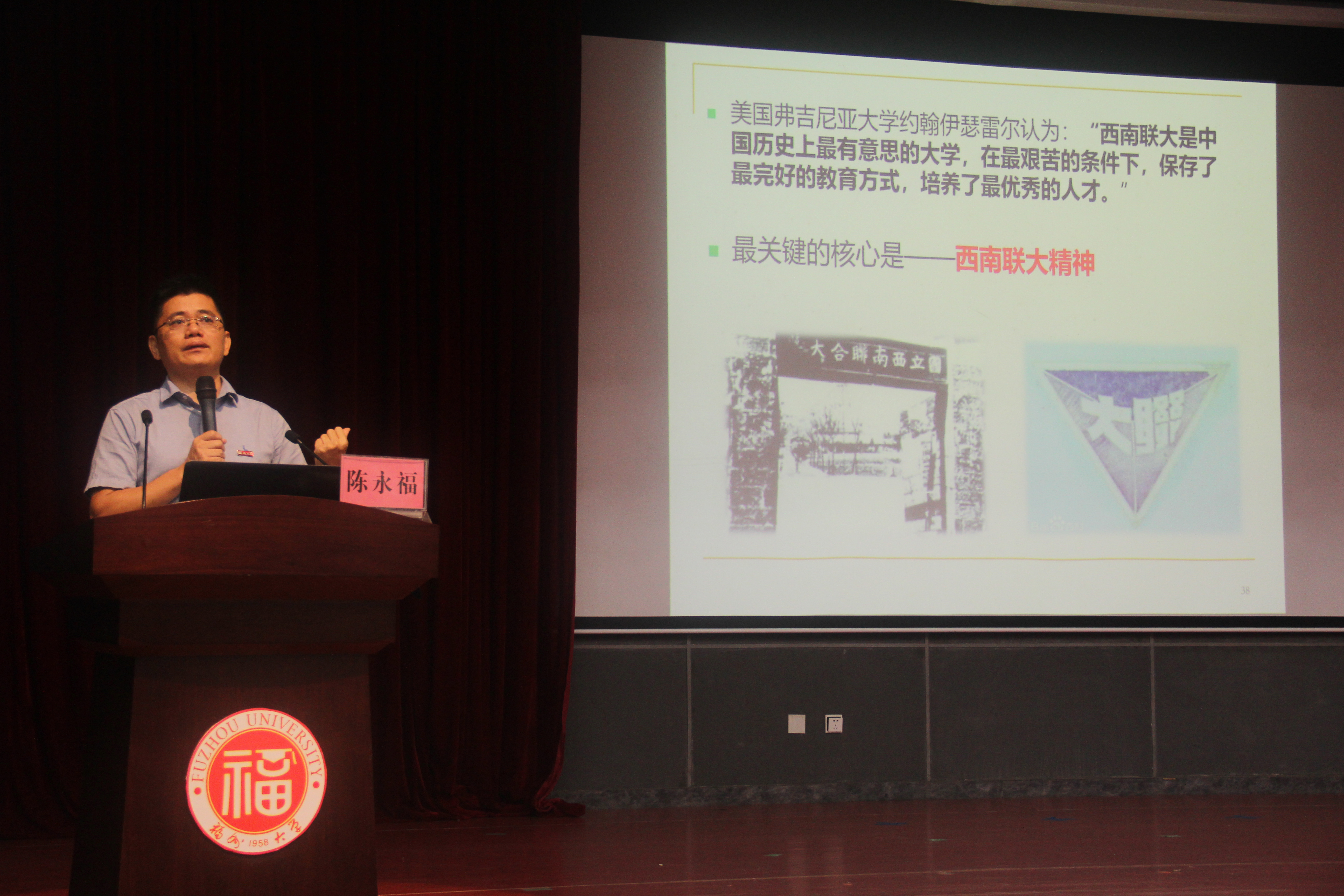 培训伊始,陈永福老师就提出了两个残酷而现实的问题,分别是“为什么来福大?”、“为什么选择这个专业?”,借此启发新生进行自我思考,告诫新生应该学会自我规划。接着,陈永福老师围绕人才培养、科学研究、社会服务、文化传承创新、国际教育合作五个方面讲解大学的职能与发展的意义,随后又介绍了中国大学发展历史的三个重要阶段。在讲到大学精神探寻时,陈老师分别从自由、人文、科学、创新、批判这五个维度对大学精神进行了深层次的剖析,涵盖了学术、道德、探索、创新、责任等多方面的认识和思考。此外,陈老师还着重向同学们介绍了西南联合大学,强调了其战时人文精神的内涵及意义,以此来加深同学们对于大学精神的认识与理解。