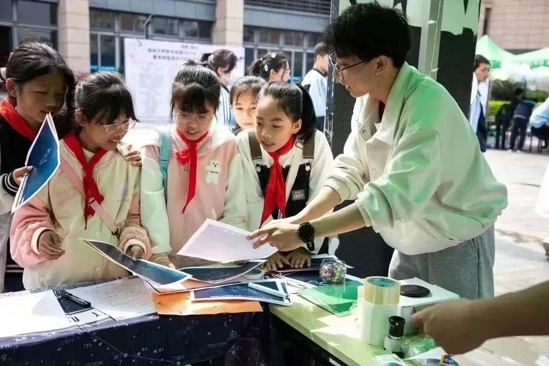 活动现场,天文学会成员们精心准备科普资料,为长乐华侨中学和福州民族小学的小朋友们作天文知识科普,带领小朋友做了许多有趣的科普小游戏,讲解星座,用天文望远镜观测太阳,十分热闹。