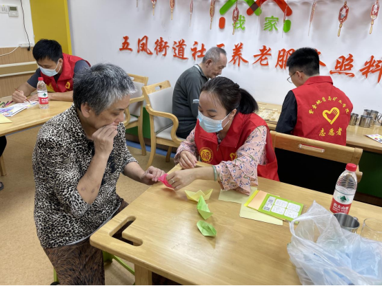 共同手工折纸。志愿者带来彩纸,与老人们共同参与折纸,折成千纸鹤、小船、花、小球、心形等,在大家的双手中,一张张彩纸逐渐变成一件件栩栩如生、惟妙惟肖的手工艺品。
