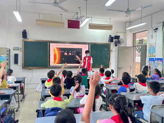 活动中,志愿队许婧妤同学与权浩同学走进课堂,走入小朋友中间,通过视频和PPT展示分别为大家带来有关“地质”与“天文”的科普知识。