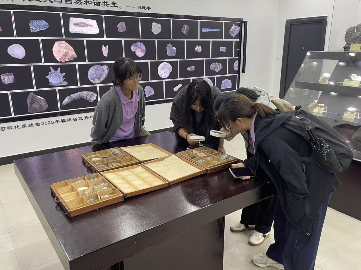 鸮头贝、菊石等化石见证地球亿万年演化的奥秘,讲解员将深奥的地质知识与现代科技、生活趣闻巧妙结合,使专业知识从书本走向现实,让同学们倍感亲切,极大地激发了新生探索地球奥秘、投身资源事业的浓厚兴趣。黄铁矿闪烁着金属光泽,透出“愚人金”特有的狡黠光彩;紫水晶盛放着梦幻般的紫色,犹如将星河的碎影封存于晶簇之中;孔雀石则更为奇妙,将孔雀羽毛上最鲜活的翠绿,“凝固”为石中永不褪色的纹理。面对这些形态各异、色彩缤纷的矿物标本,同学们对矿物科学的专业兴趣,正悄然在心中生根发芽。